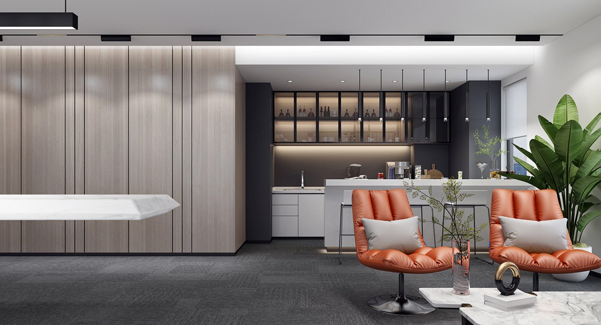 天然的材料(如吸音織物和木板/門)與嵌入在涂有聚氨酯涂料的面板連接槽中的硬線LED燈具很好地保持了平衡。即使在充滿張力的空間中,它也會通過在藝術品上添加一些有機特征來賦予其柔軟感。